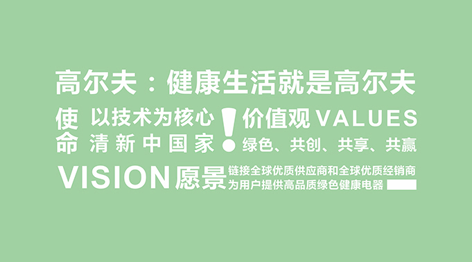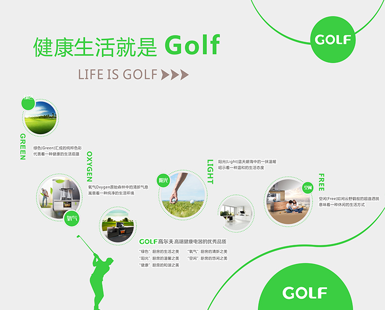 2008年中国厨电行业知名企业超人控股集团有限公司推出高尔夫高端健康电器品牌,“高尔夫”秉承高贵、尊荣的生活理念,旨在给热爱生活、追求时尚、健康的人们营造一种新的生活方式——厨房不再只是烹饪之地,而且是享受之所,让厨房成为时尚生活的美妙构成元素。正如高顿投资集团Mike·Wang博士口头禅说的那样:生活就是Golf(Green绿色、Oxygen氧气、Light阳光、Free空闲)。绿色(Green)汇成的纯粹色彩,代表着一种健康的生活底蕴;氧气(Oxygen原始森林中的清新气息,寓意着一种纯净的生活环境;阳光(Light)蓝天碧海中的一抹温暖,昭示着一种温和的生活态度;空闲(Free)如闲云野鹤般的超逸洒脱,意味着一种休闲的生活方式。高尔夫高端健康电器同时拥有以上的优秀品质。拥有它,您就拥有“绿色”厨房的生活之美、“氧气”厨房的清新之美、“阳光”厨房的温馨之美、“空闲”厨房的悠闲之美、“健康”厨房的和谐之美。